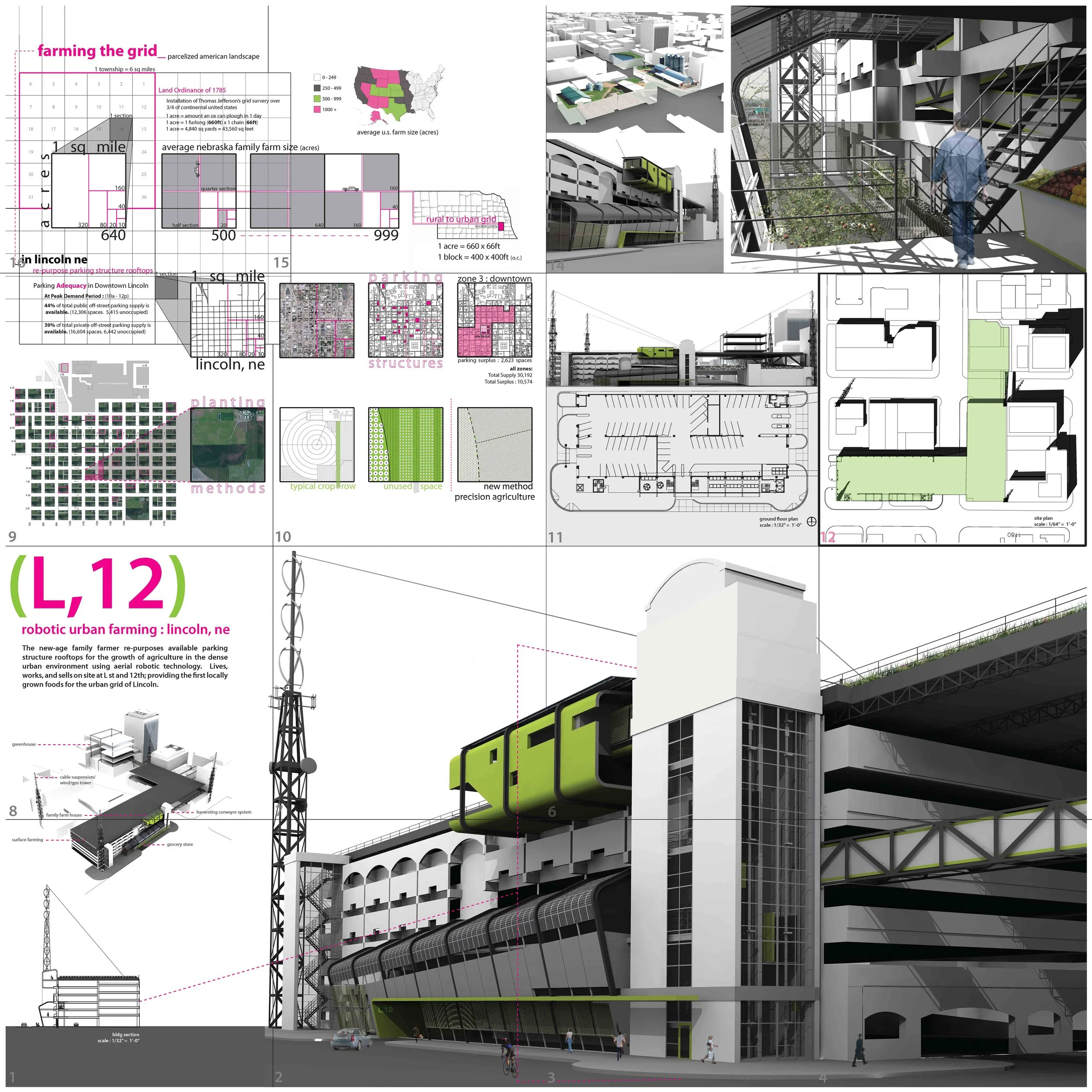 This studio was co-developed and offered by Chris Ford (formerly University of Nebraska) and Ted Shelton (University of Tennessee) following their learning of one another’s infrastructure research during a conference in La Coruna, Spain. It shared a common set of assignments organized around field trips to both Lincoln NE and Knoxville TN. These trips enabled visits to significant infrastructure assets, exposure to guest lecturers, ideation through a conjoined charette, and yielded research deliverables with conjoined authorship. Student projects engaged the question of how infrastructure facilitates urban dwelling with proposals yielding two or more types of resource units through design hybridization from the infrastructural sectors of Agriculture, Energy, Transportation, Waste, or Water.